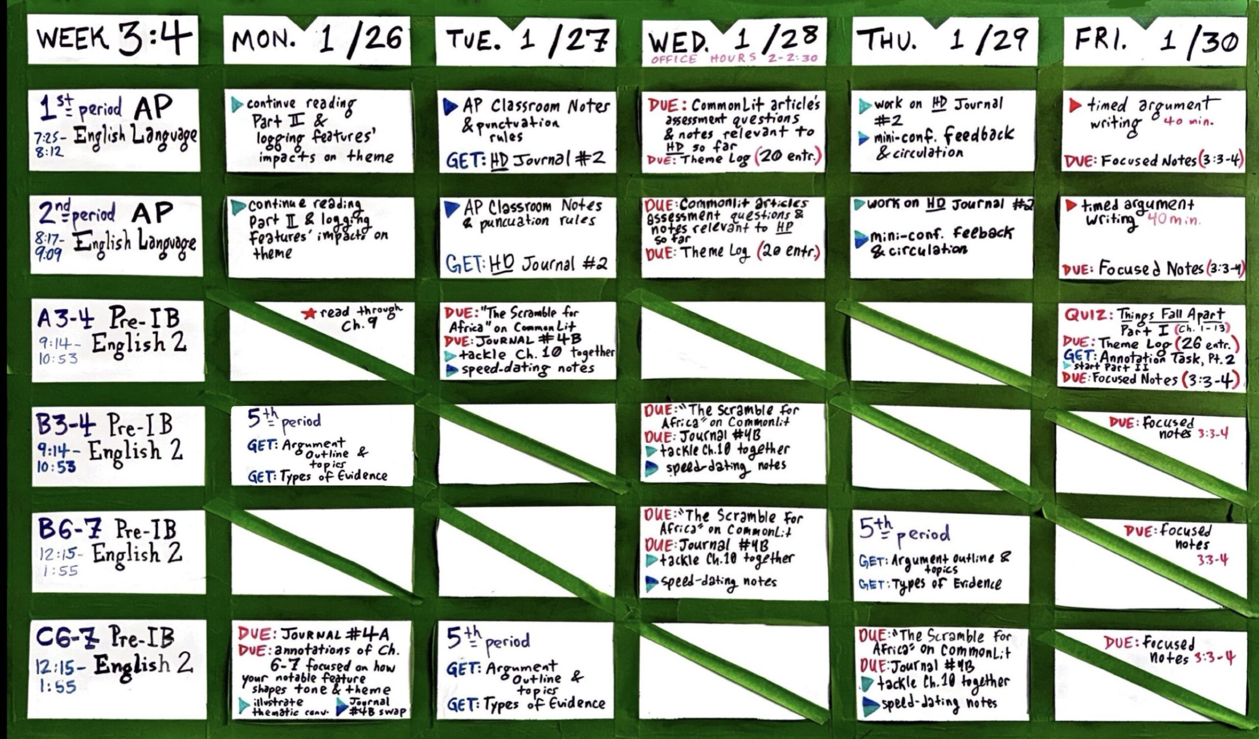 IB Freshmen: PM2 Data Reflection Form, Reading Comprehension Protocol, Sub Con Kit, Analytical Verbs, Weaving & Citing, Wheel of Feels (Tone), Claim Frames & Analytical Verbs; Argument: Types of Evidence, Outline, Topics, Audience Breakdown; Things Fall Apart: E-text, Theme Log, Background & Informal Research Task, Audiotext, Pre-Notes, Journal #4B, Journal #4C, #4D, Annotation Task (Directions), Annotation Task (Padlet)