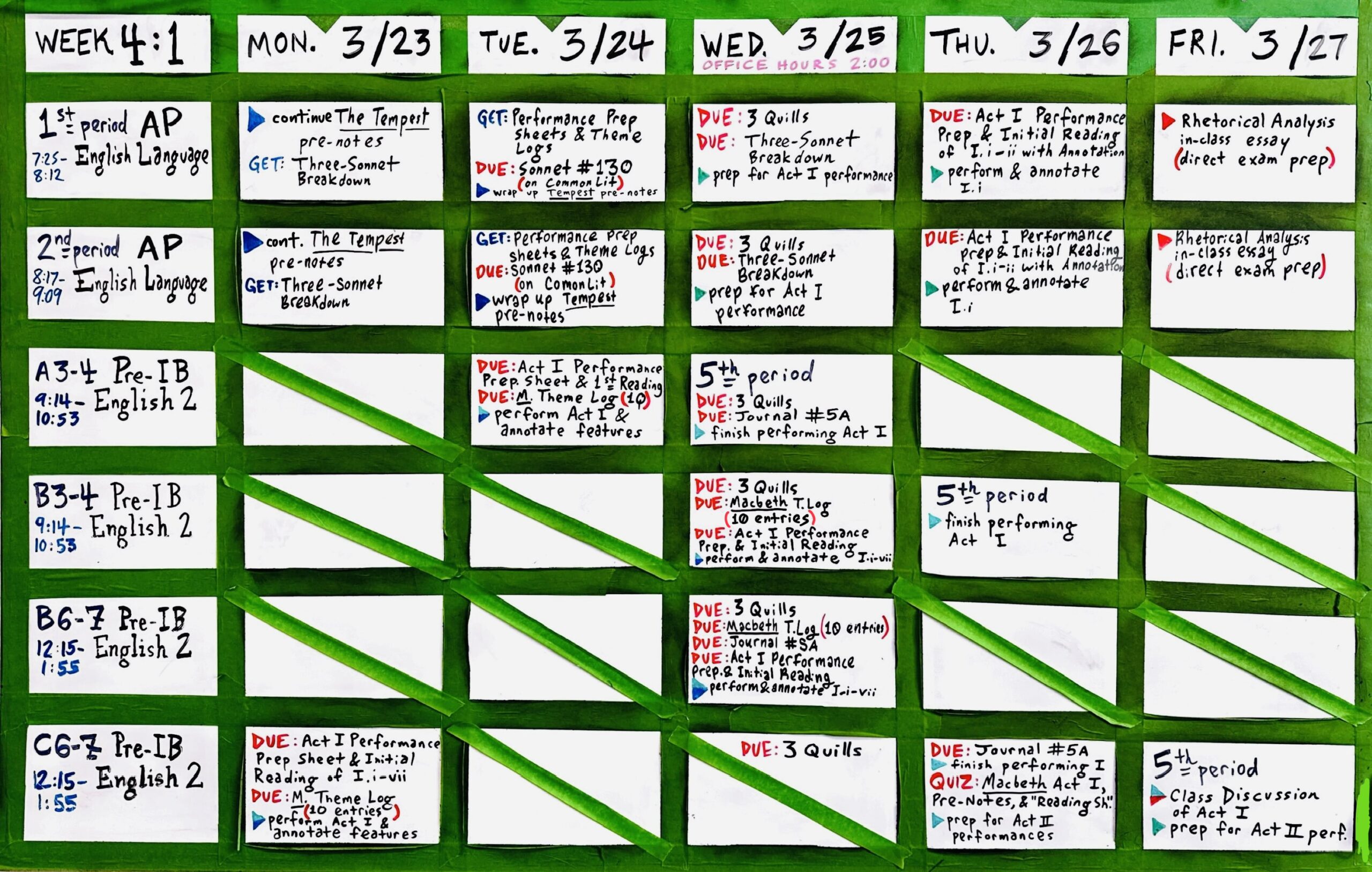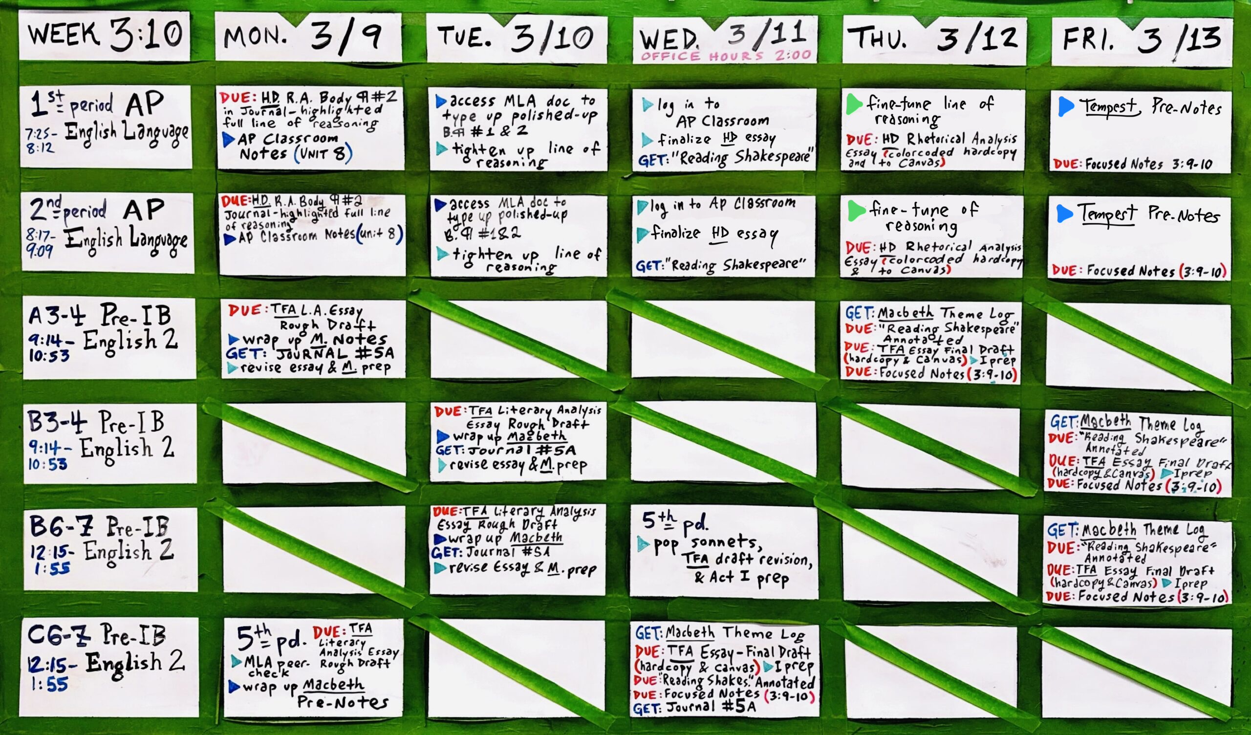 IB Freshmen: the RCP, the Sub-Con Kit, Analytical Verbs, Wheel of Feels, Claim Frames & Analytical Verbs, Analyzing Diction & Syntax, TFA E-text, Blank Outline, Outline Checklist, MLA Template, Literary Analysis Thesis Frame, Essay Rubric; Macbeth: Sonnet Breakdown, Theme Log, Interactive E-text (CLASS CODE: G9CDBT), Plain E-text, Vocab Practice, Audioplay, Pre-Notes,“Reading Shakespeare” Doc, Journal #5A, Performance Jobs & Schedules (A3–4, B3–4, B6–7, C6–7)