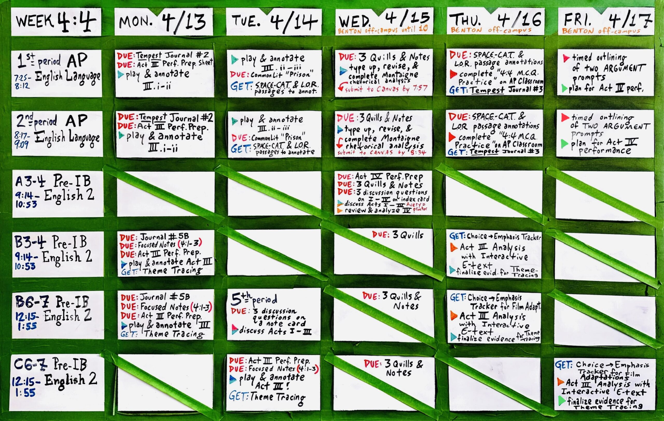 AP Language: HD Essay Rubric Reflection, Sub Con Kit, Thesis Frames, Analytical Verbs, Wheel of Feels (for Tone), Diction & Syntax, Blank Outline; Analysis: RA Thesis Frame, CB Rubric, Structural Rubric, SPACE-CAT, Rhetorical Terms; Synthesis/Argument: Rubric, Transitions, Evidence, Appeals; The Tempest: E-text, Audioplay, Theme Log, “Reading Shakespeare”, Pre-Notes, Vocab Practice, Character List & Job Chart, Journal #2, Performance Jobs: (1st period & 2nd period)