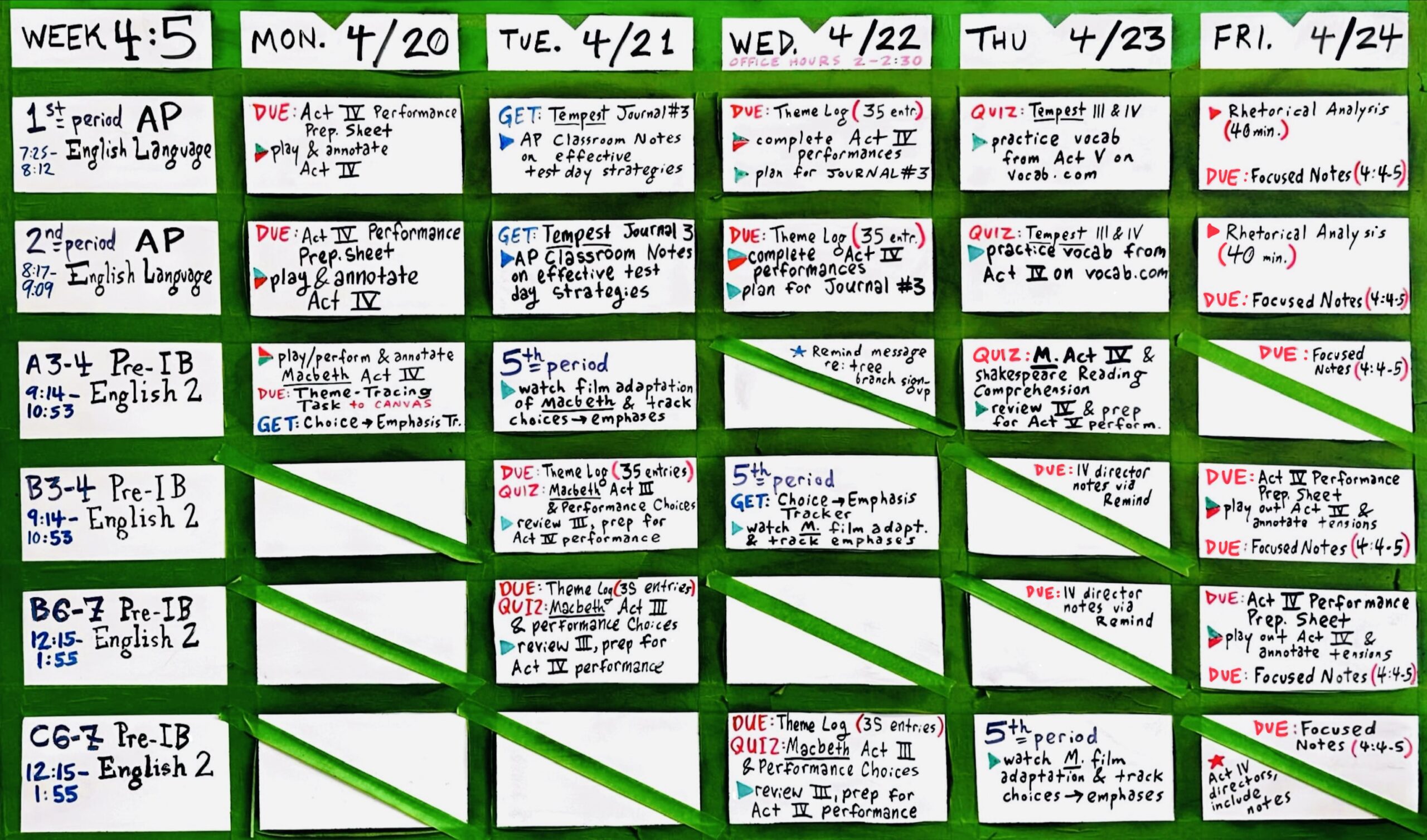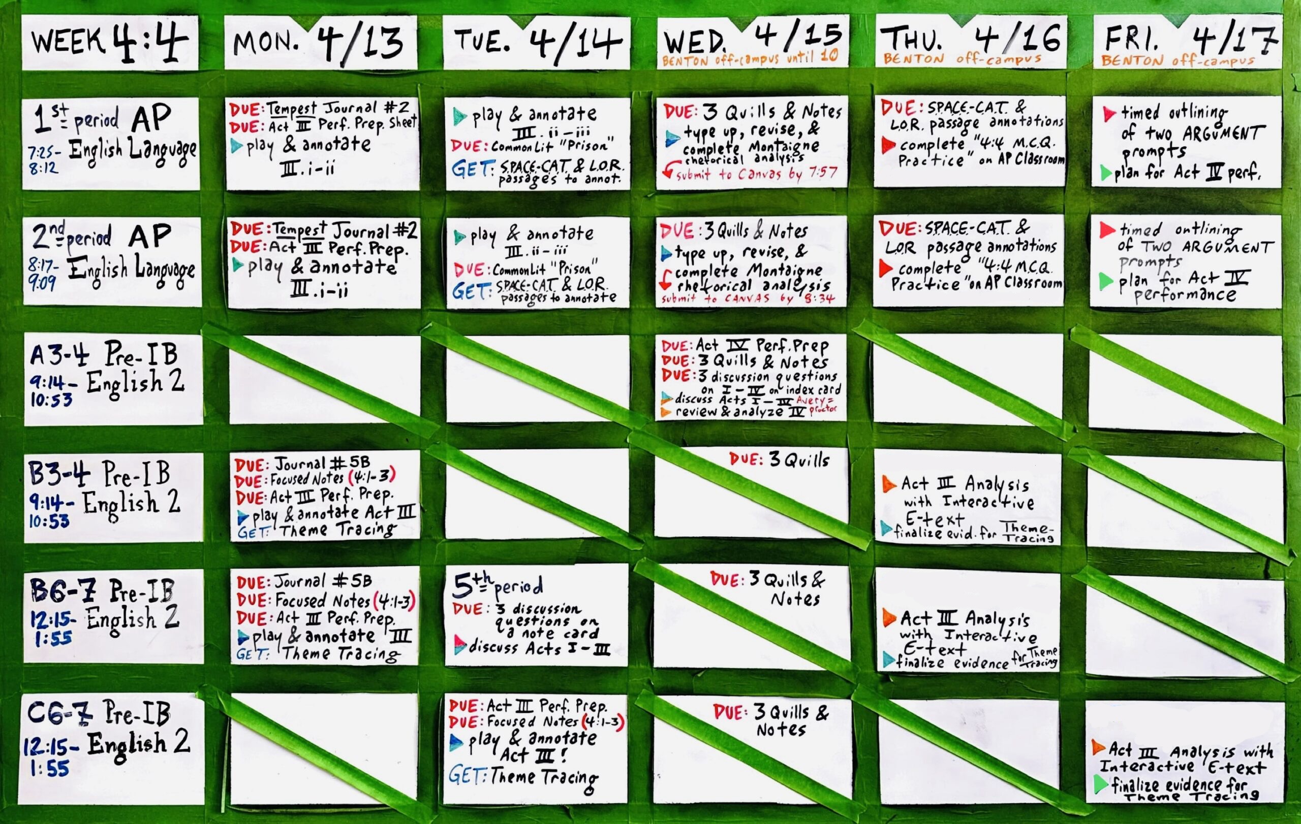 AP Language: Two Passages to Annotate, Sub Con Kit, Thesis Frames, Analytical Verbs, Wheel of Feels (for Tone), Diction & Syntax, Blank Outline; Analysis: “Of Cannibals” Excerpt, RA Thesis Frame, Official Rubric, Structural Rubric, SPACE-CAT, Rhetorical Terms, HD Essay Rubric Reflection; Synthesis/Argument: Outlining Two Argument Prompts, Rubric, Transitions, Evidence, Appeals; The Tempest: E-text, Audioplay, Theme Log, “Reading Shakespeare”, Pre-Notes, Vocab Practice, Character List & Job Chart, Journal #2, Performance Jobs: (1st period & 2nd period)