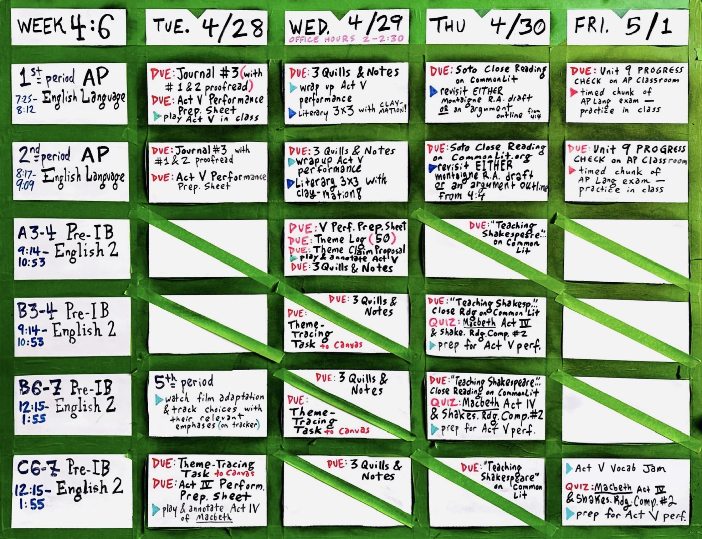 AP Language: AP Lang Testing Rooms, Sub Con Kit, Thesis Frames, Analytical Verbs, Wheel of Feels, Diction & Syntax, Blank Outline; Analysis: “Of Cannibals” Excerpt, RA Thesis Frame, Official Rubric, Structural Rubric, SPACE-CAT, Rhetorical Terms; Synthesis/Argument: Rubric, Transitions, Evidence, Appeals; The Tempest: E-text, Audioplay, Theme Log, Vocab Practice, Journal #3, Character List, Performance Prep Sheet, Performance Jobs: (1st pd. & 2nd pd.)