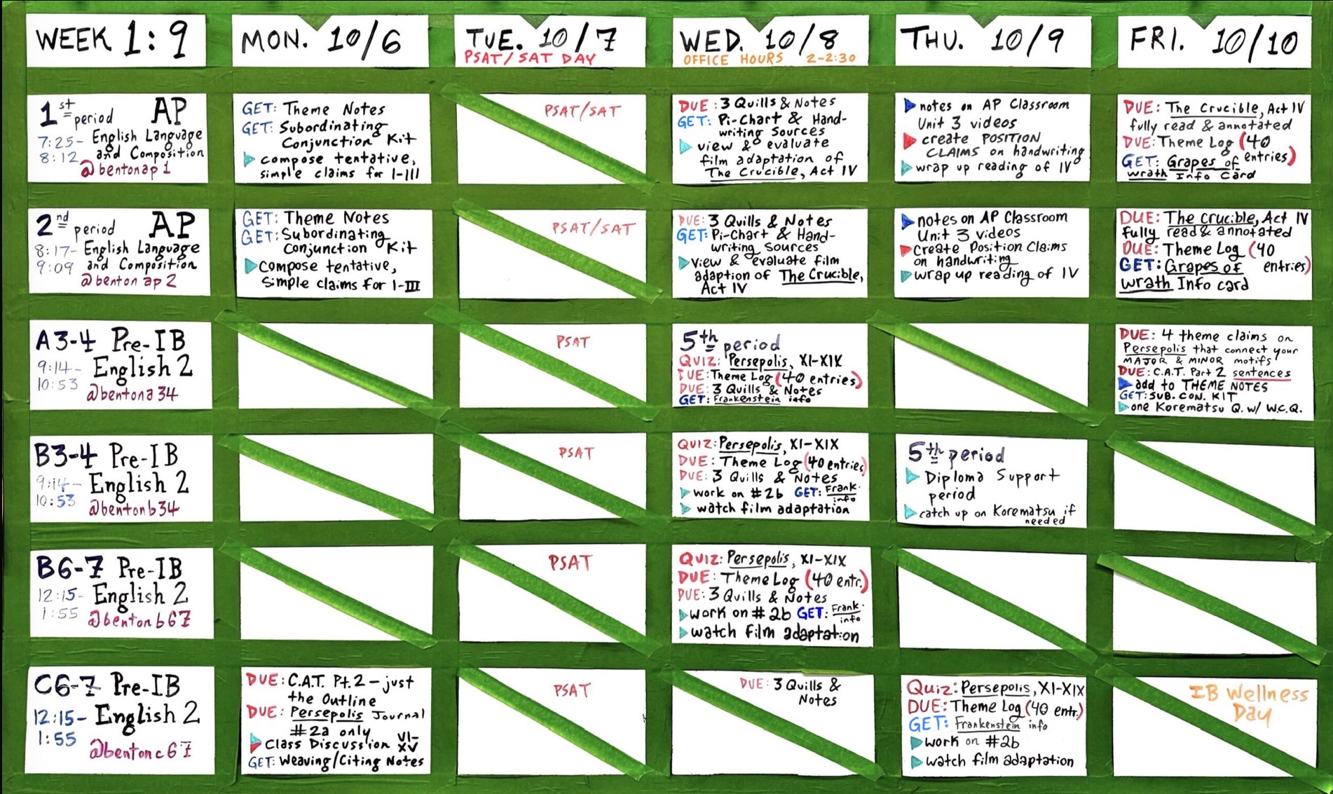 IB Freshmen: Sub Con Kit, MLA Template, Analytical Verbs, Weaving & Citing Guide, Wheel of Feels / Korematsu Case: Black & Murphy Task, SPACE-CAT & Rhetorical Terms, TEDed Video, US Gov’t Video / Persepolis: E-text, Graphic Novel Terms, Journal / Frankenstein: Pre-Notes (just the Visuals), E-text, Audiotext, Theme Log