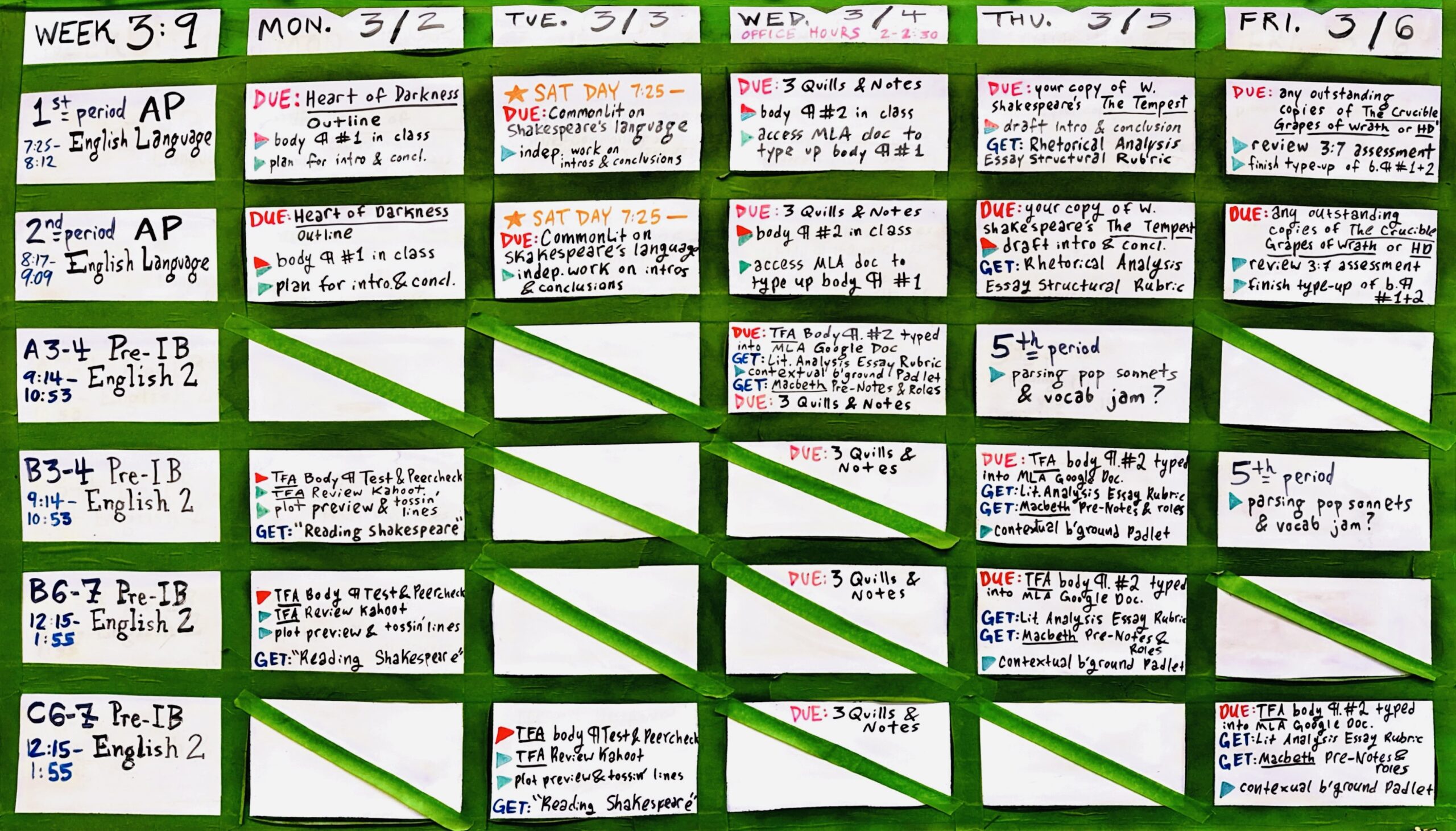 IB Freshmen: the RCP, the Sub Con Kit, Analytical Verbs, Wheel of Feels, Claim Frames & Analytical Verbs, Analyzing Diction & Syntax; Argument: Outline, Evidence, Appeals; Things Fall Apart: E-text, Blank Outline & Outline Checklist, Literary Analysis Thesis Frame, Essay Rubric; Macbeth: Sonnet Breakdown, Theme Log, Interactive E-text (CLASS CODE: G9CDBT), Plain E-text, Vocab Practice, Audioplay, Pre-Notes, “Reading Shakespeare” Doc, Roles & Responsibilities